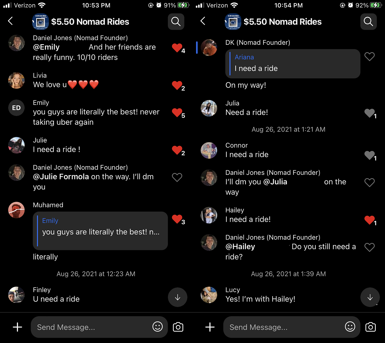 Finally, GroupMe was a terrific way for us to quickly overcome the trust barrier. For the wary students who weren’t convinced by the legitimacy of our service even after seeing our Forbes article, the group chat became a public ledger where anyone could easily verify the safety of the transported students. The Venmo-esque broadcasting feed of ride requests and raving reviews of our drivers from the most popular sorority students propelled Nomad’s status into the next big thing everyone wanted to be associated with.